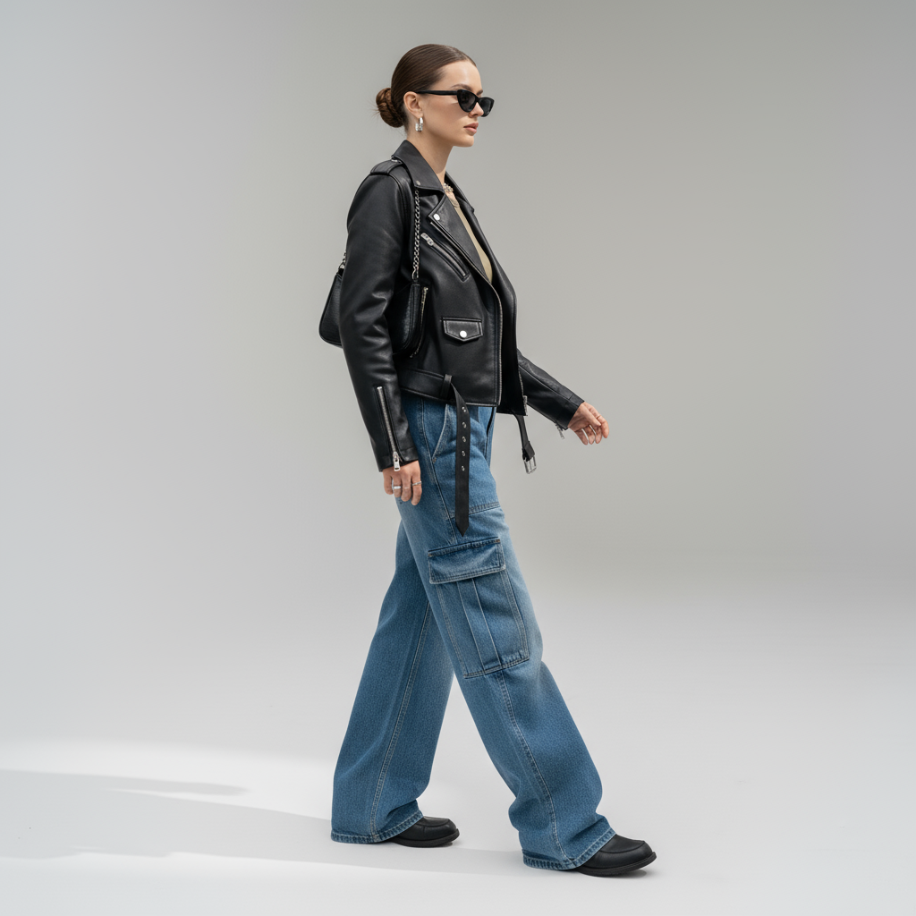 A classic biker jacket with a modern edge. Made from smooth faux leather, it features silver-tone zippers, snap details, and a belted hem for a timeless look. Designed with a structured fit that pairs perfectly with denim or cargo pants for effortless street style.