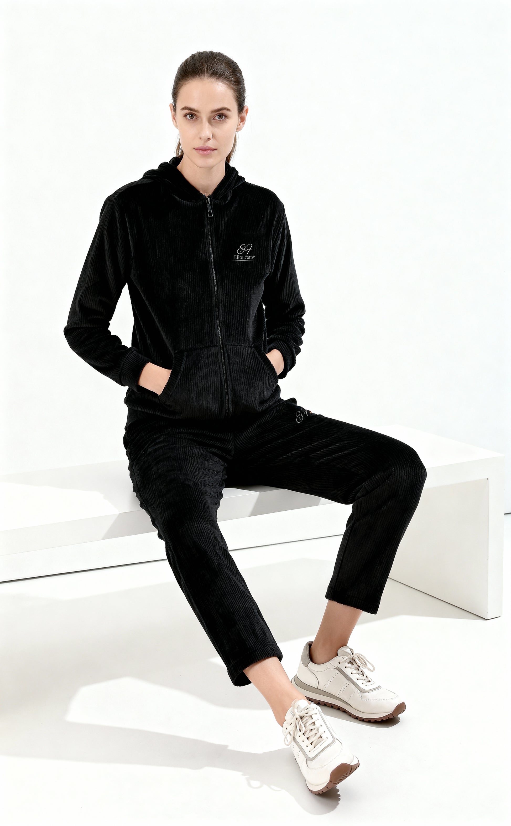 A matching set in soft, ribbed velvet with a smooth, luxurious texture. Designed in a deep black tone for a refined, versatile look. Includes a zip-up hoodie with front pockets and coordinating joggers for effortless comfort and style. Finished with subtle embroidered monogram detailing.
