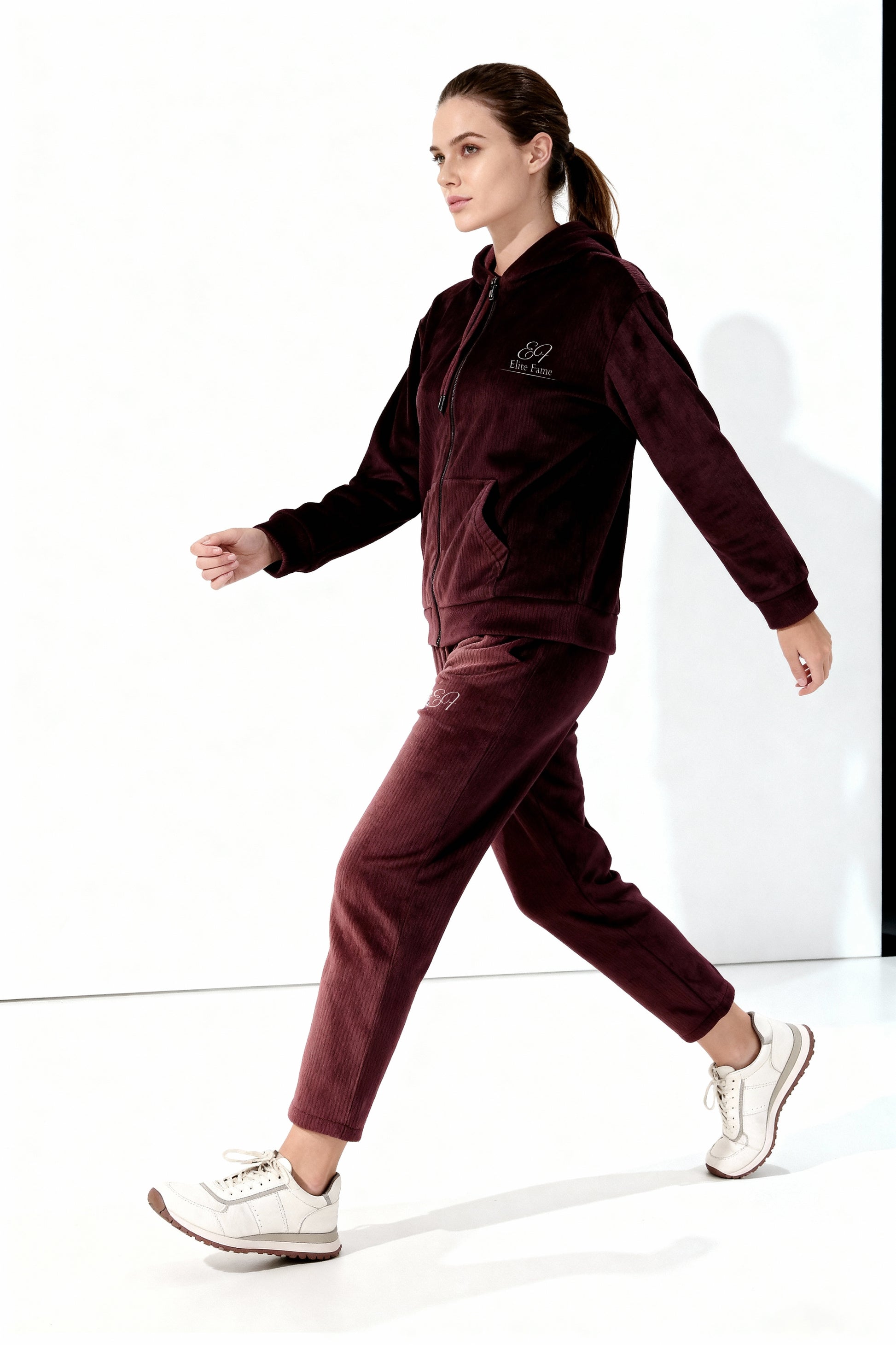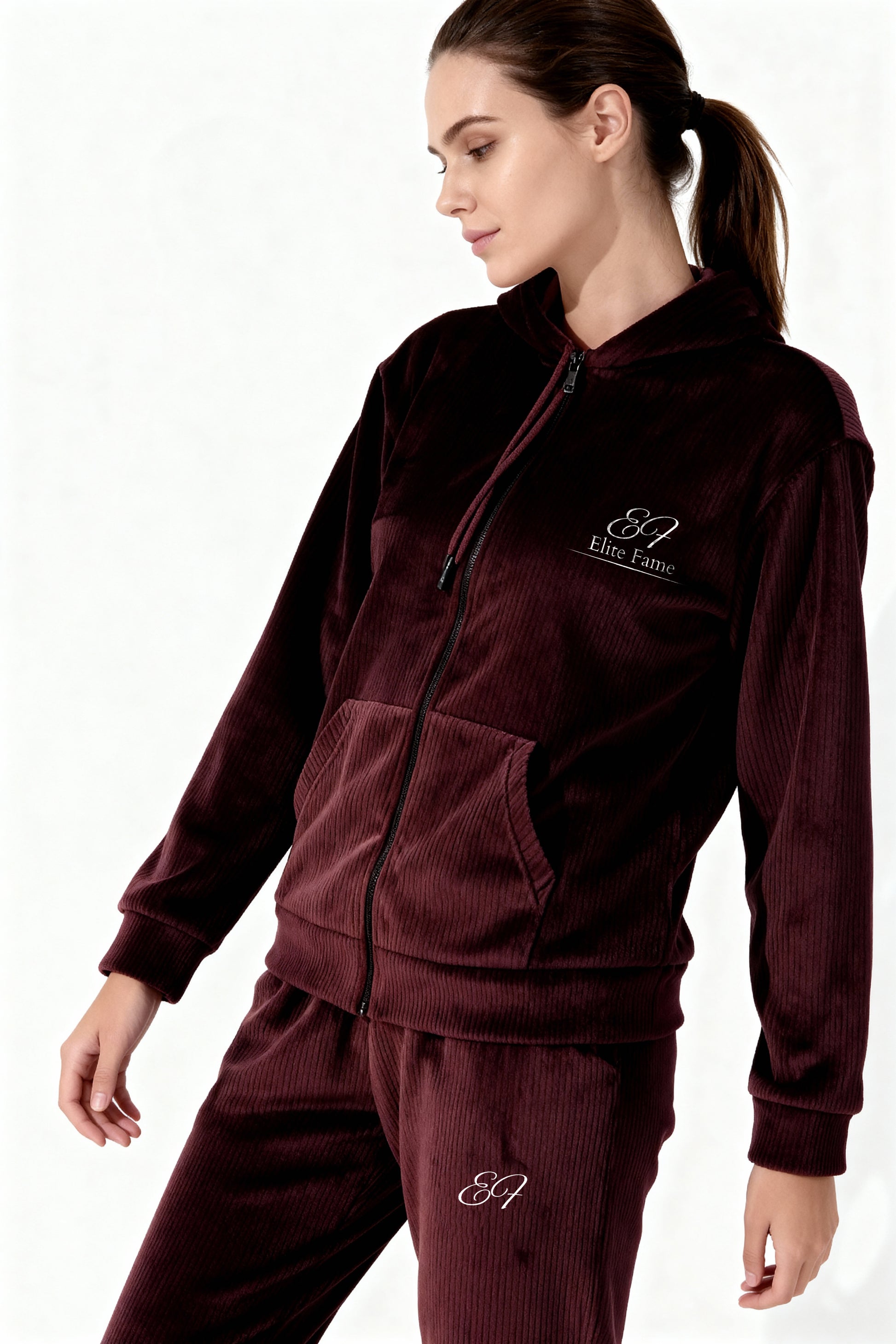 A matching set in soft ribbed velvet with a smooth, luxurious feel. Designed in a deep maroon tone for a refined, elegant look. Includes a zip-up hoodie with pockets and coordinating joggers for effortless comfort and style. Finished with a subtle embroidered monogram for a touch of sophistication.