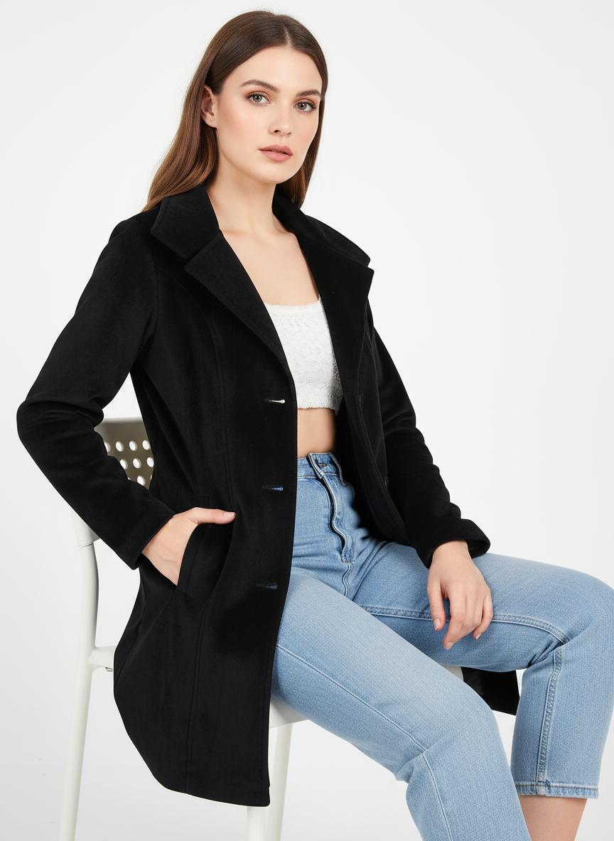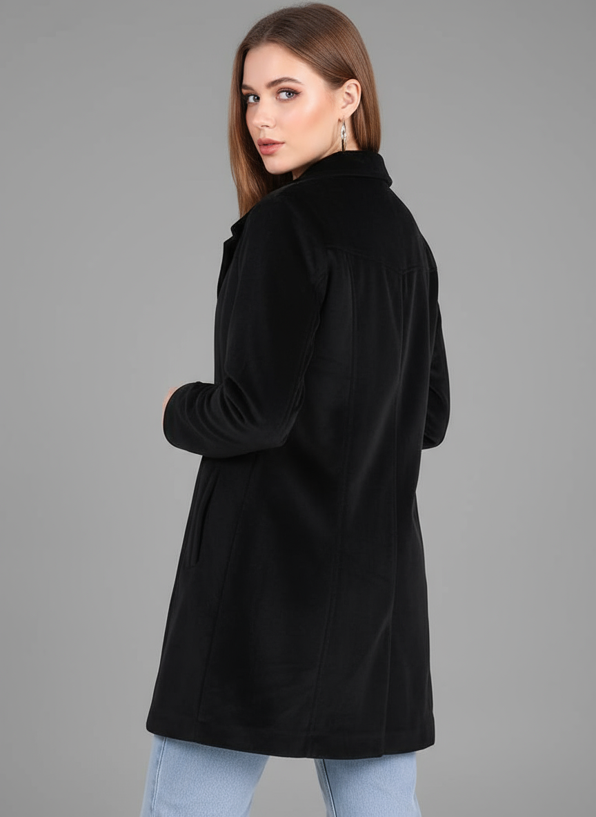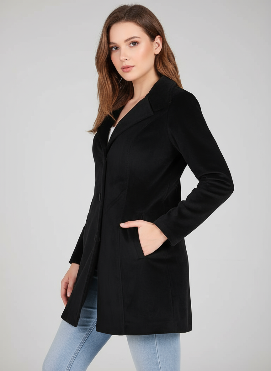 The tailored silhouette, structured shoulders, and polished button-down front create a look of effortless poise. Designed to provide warmth and comfort without compromising on style, D’Valenora™ transitions seamlessly from day to night.