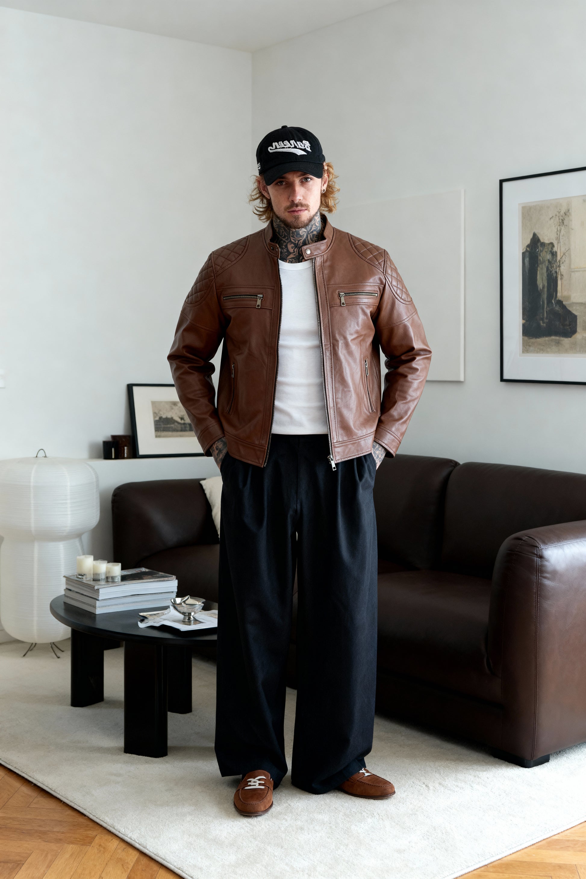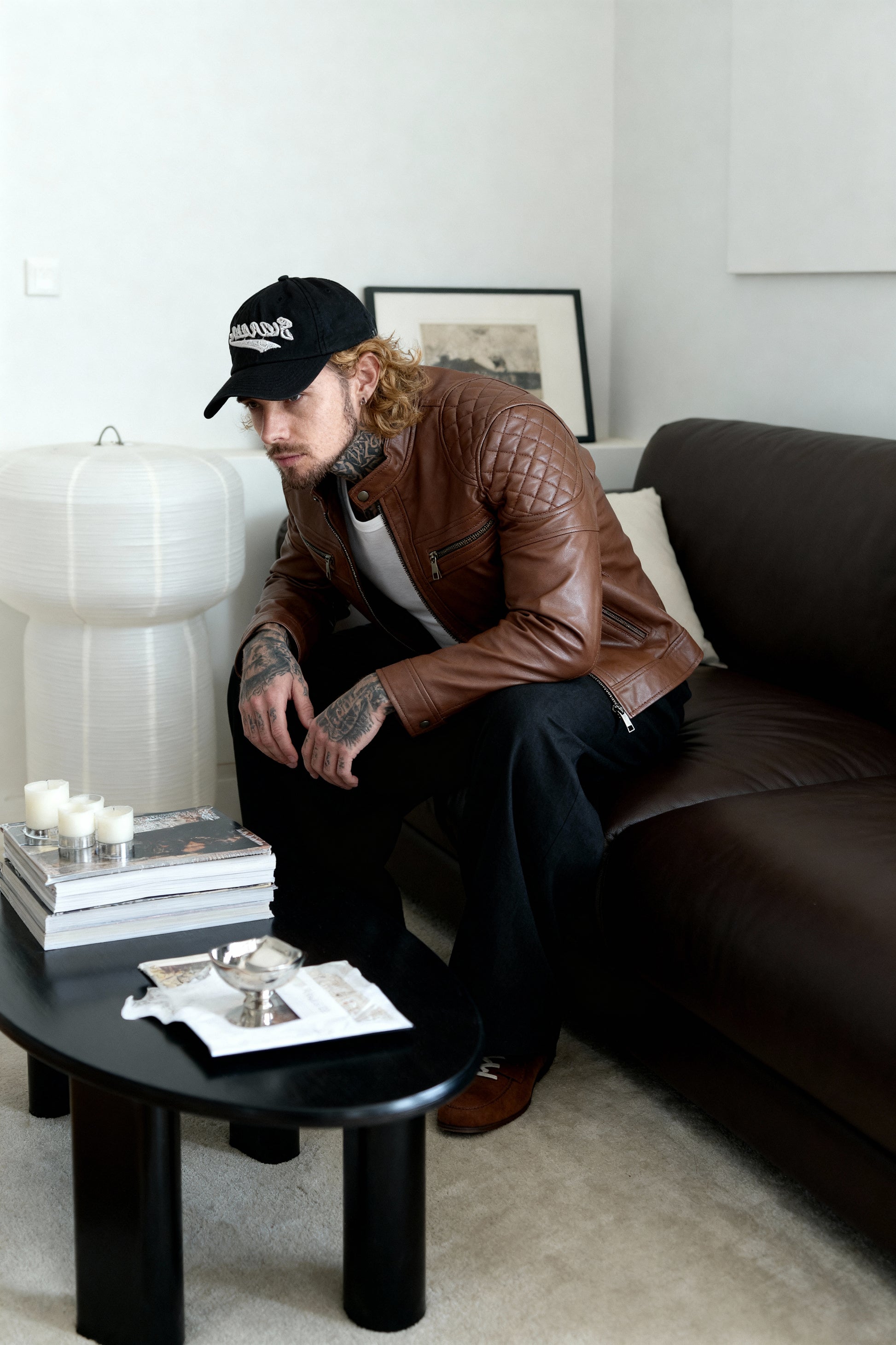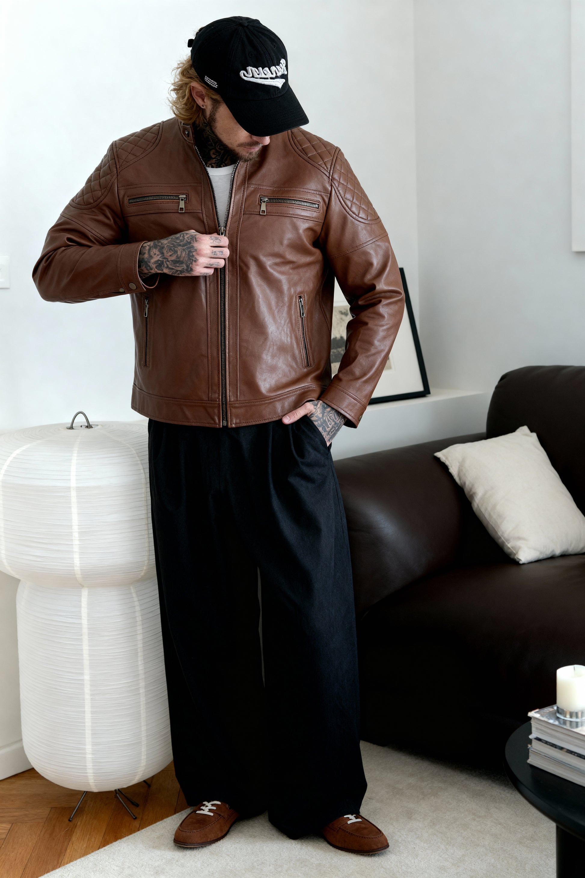 A timeless biker jacket in premium genuine leather with a rich vintage tan finish. Designed with quilted shoulders and antique brass zippers for a refined, rugged look. The tailored slim fit and soft satin lining deliver comfort and style that lasts season after season.