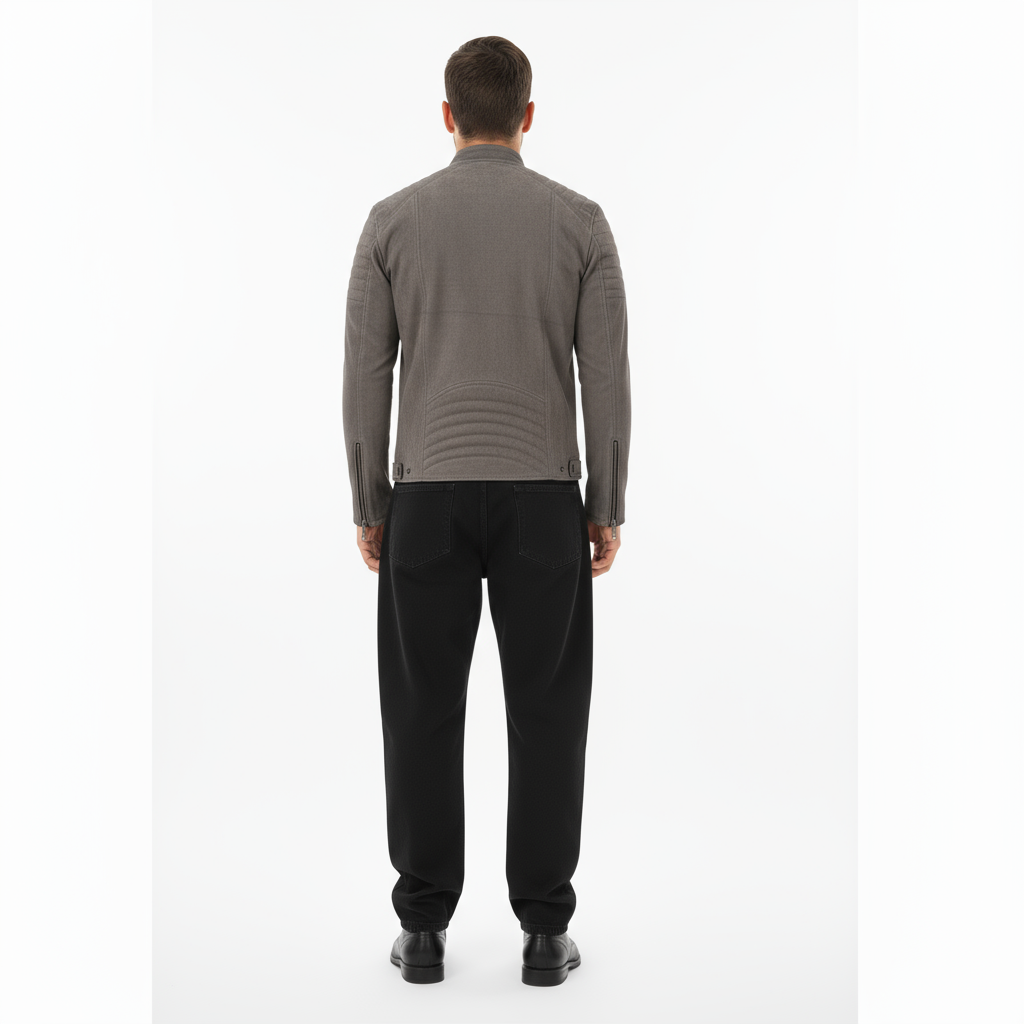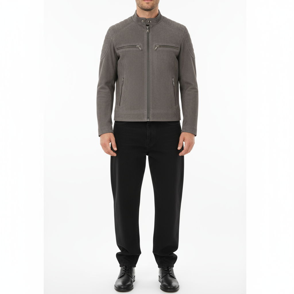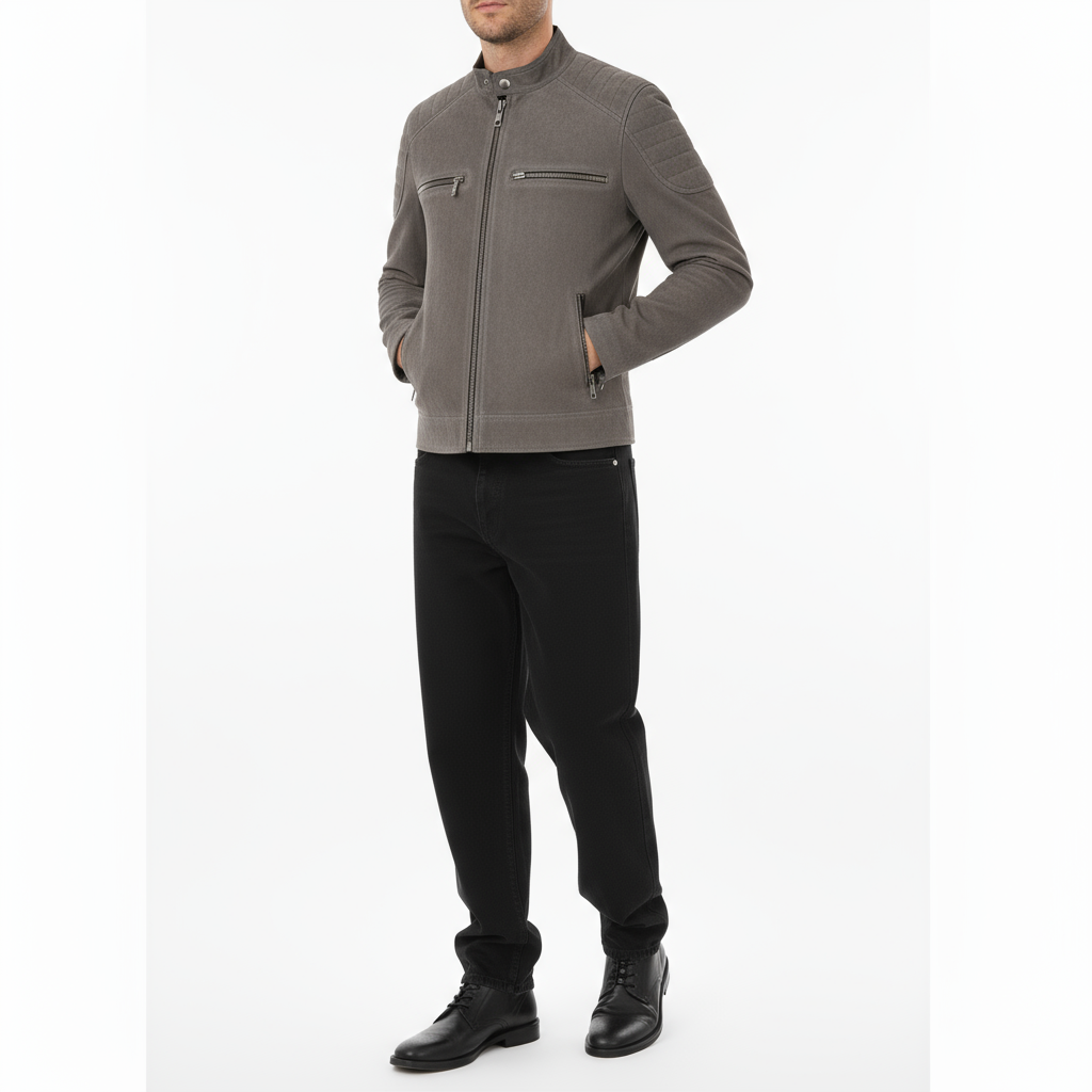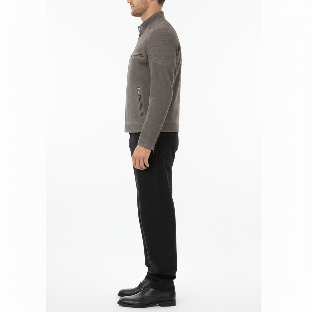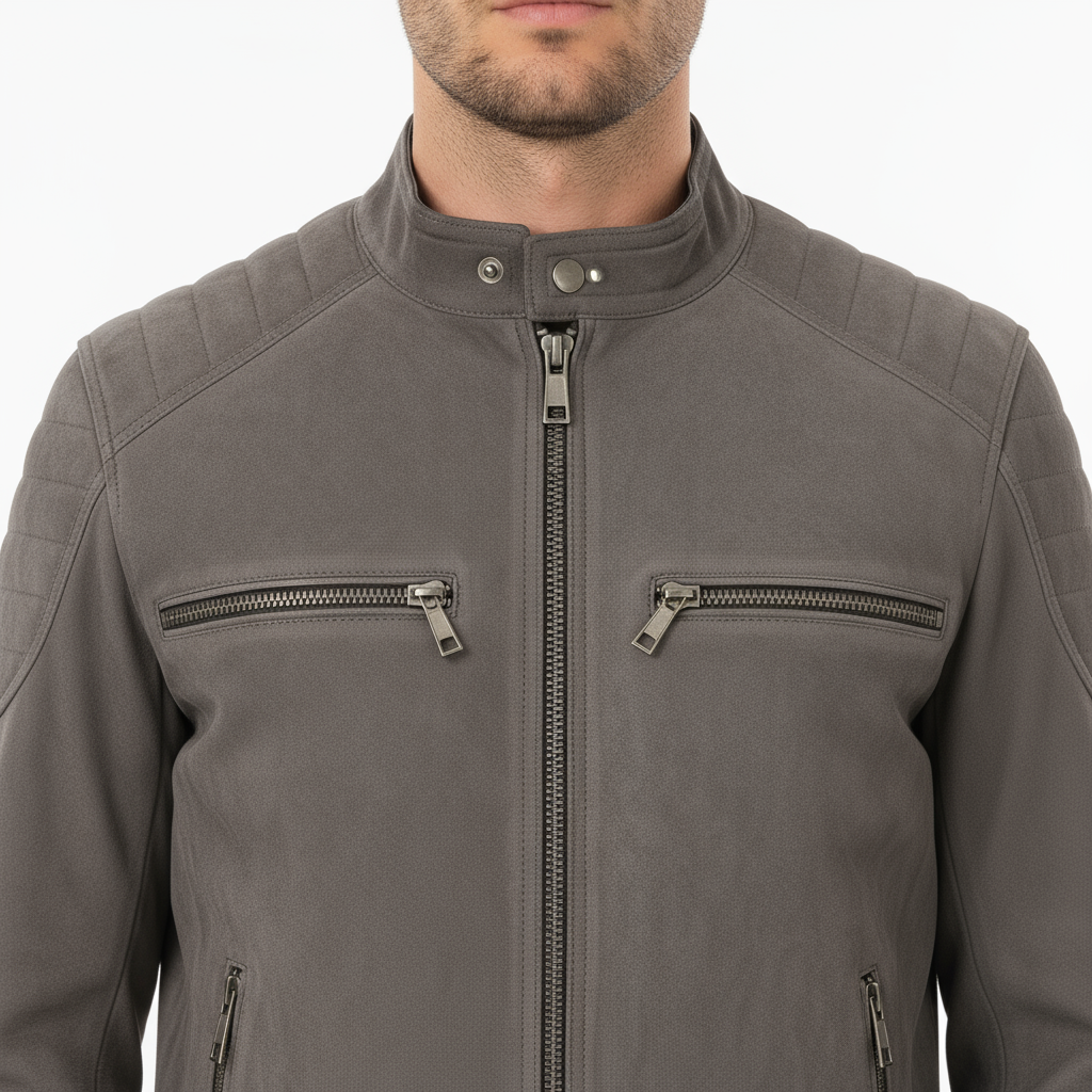 A sleek biker-style jacket in soft faux suede for a smooth, refined look. Designed with quilted shoulder detailing, metallic zippers, and a stand collar with snap button for a modern edge. The tailored fit and smooth lining offer comfort and structure, making it a versatile choice from day to night.